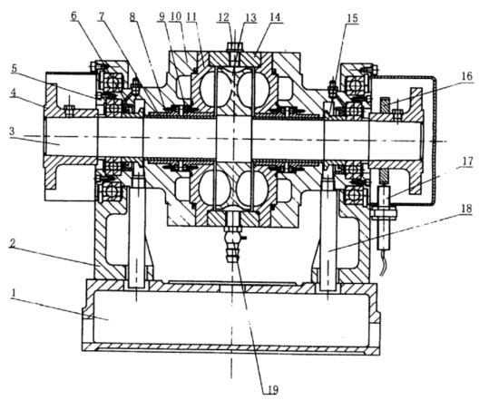 7、軸套  8.9、雙金屬軸套  10、左右軸承外殼  11、左右側殼  12、螺塞  13、轉